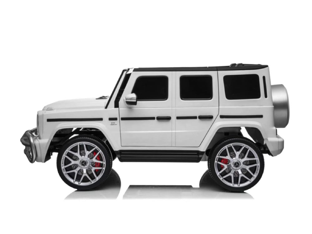 Dankzij de 4 krachtige 24 volt motoren komt deze robuuste G-klasse niet vast te staan en haalt een maximale snelheid van 8 km per uur. Deze 2-zits accu voertuig is geproduceerd onder licentie van MERCEDES-BENZ. Verder is de Mercedes G63 uitgevoerd met veel opties als: 2 echte deuren, volledig rubberen banden, lederzitje, geveerde wielen, ledverlichting, muziekjes en MP3- en USB-aansluiting en Bluetooth connectie voor eigen muziek. Met de “soft start” functie voelen kinderen geen schokje bij het optrekken.