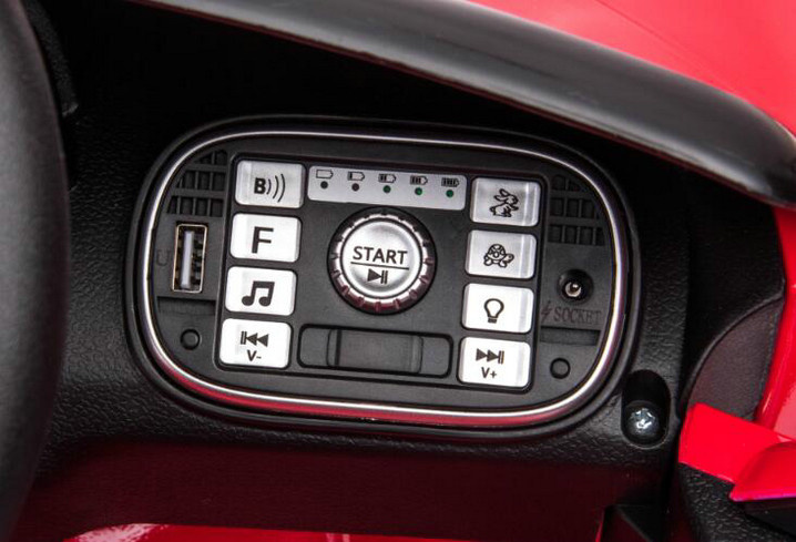 Verder is kinderauto voorzien van een kunstleder zitje, veiligheidsgordelrubberen banden, geveerde wielen2 echte deuren, koplampen, dashboard verlichting, muziek module met USB-ingang en Bluetooth om eigen muziek af te spelen.