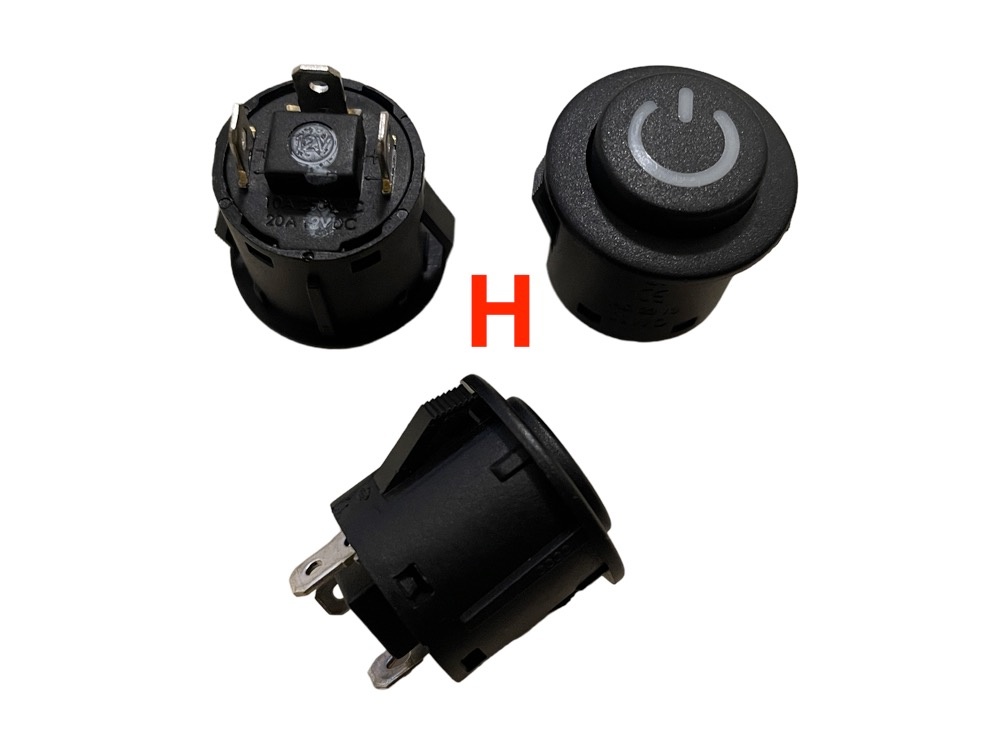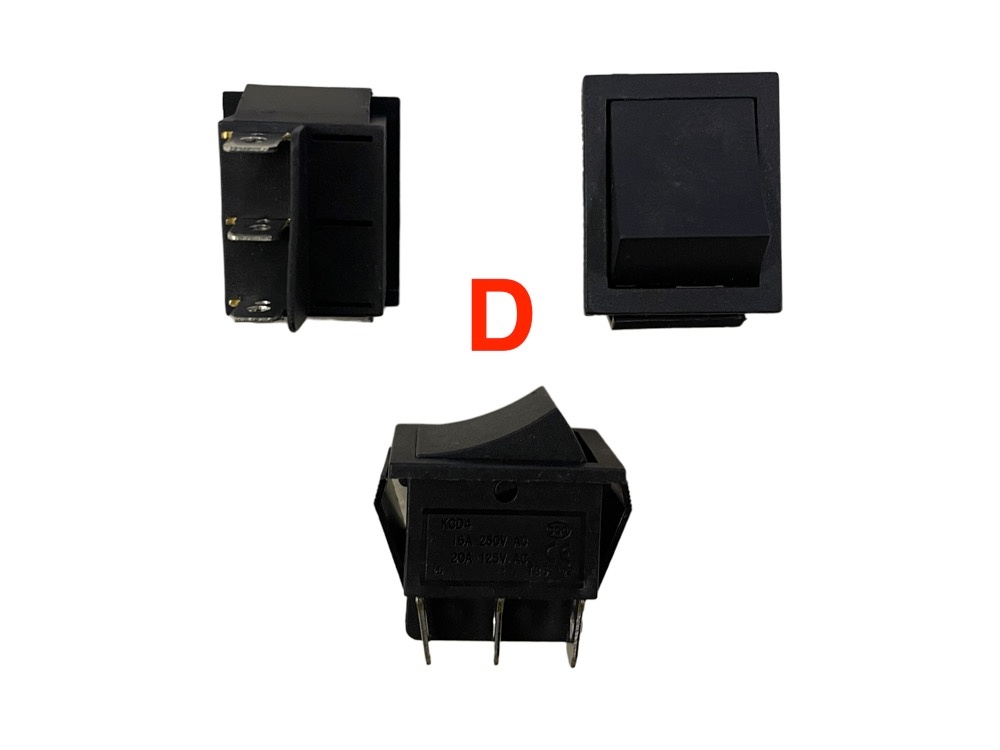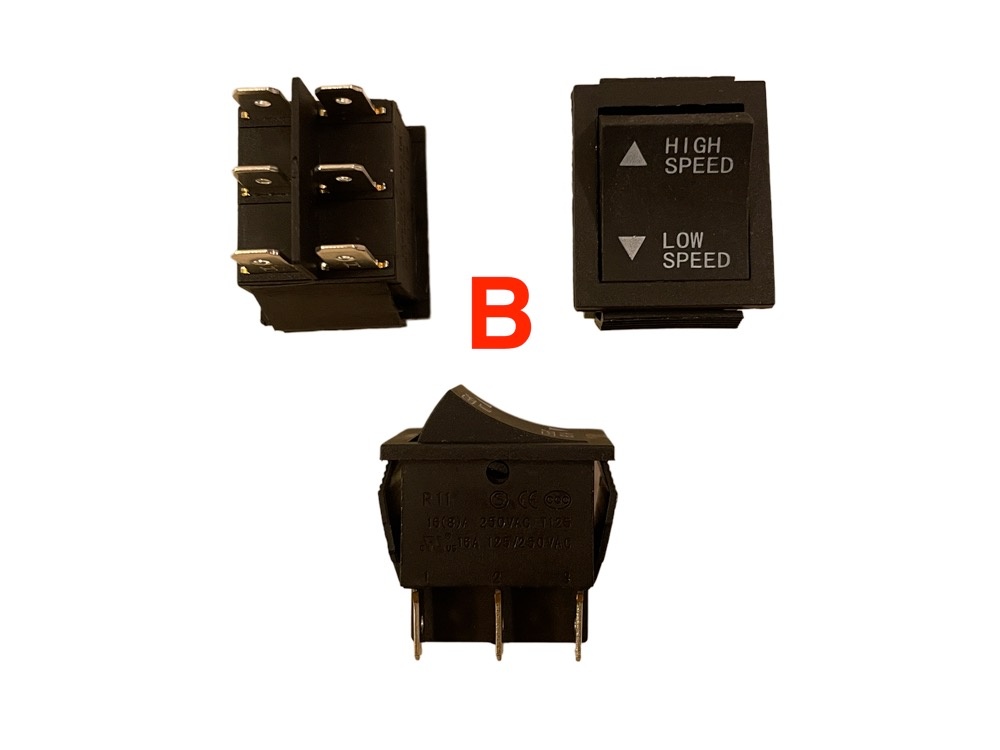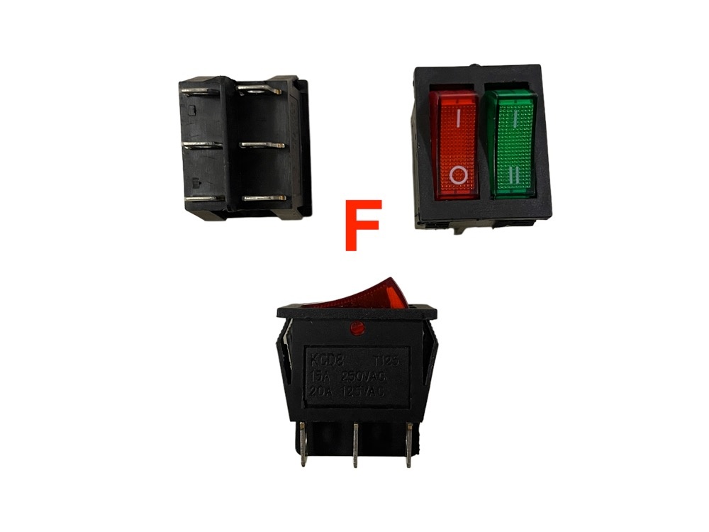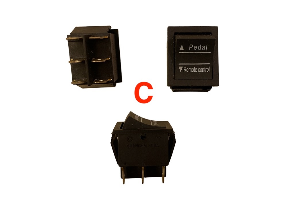 | Keuze | (A) Forward – Stop – Backward, (B) High Speed – Low Speed, (C) Pedal – Remote Control, (D) Gaspedaal standaard 3 pins, (E) Gaspedaal met rubber 6 pins, (F) Aan – Uit / 1 en 2 snelheden, (G) ON – OFF Blok, (H) Aan – Uit rond voor gatmaat 22m, (i) Aan – Uit rond voor gatmaat 22mm, (J) Aan – Uit rond voor gatmaat 24mm, (K) Aan – Uit rond voor gatmaat 23mm, (L) 12 volt Aan – Uit rond voor gatmaat 25mm, (L) 24 volt Aan – Uit rond voor gatmaat 25mm |